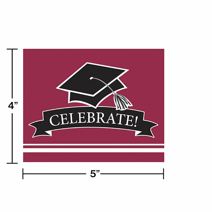 Details: Amaze your future graduation party or open house guests with these School Spirit Invitations. The invites display a mortarboard and the text “You’re Invited” and feature ample room for personalized notes and envelopes for easy mailing. Keep up the School Spirit theme by matching these invitations with other party supplies and decorations. With discount pricing, our Graduation School Spirit Burgundy Red Invitations are perfect for event planners, caterers, and home hostesses alike. For this price, you get one package containing (25) Graduation School Spirit Burgundy Red Invitations. Approximate Dimensions: 4 in x 5 in