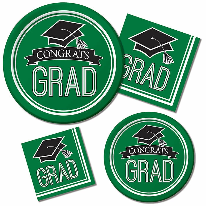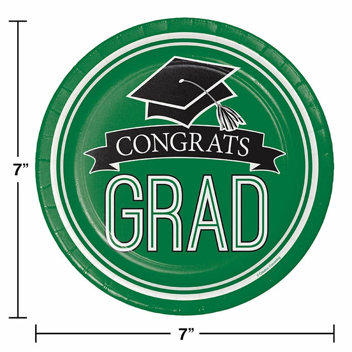 Details: Serve delicious slices of graduation cake on tableware that matches the graduate’s high school or college school colors with the School Spirit Green Dessert Plates. Featuring a classy design of a mortarboard and “Congrats Grad” message in the center, these Sturdy Style cake plates will show your school spirit and provide a nice touch to the end of a long journey. Coordinate the round plates with other School Spirit theme party supplies to celebrate the hard-working graduate’s accomplishment. For this price, you get one package containing (18) Graduation School Spirit Green Dessert Plates. Approximate Dimensions: 6.875 in x 6.875 in