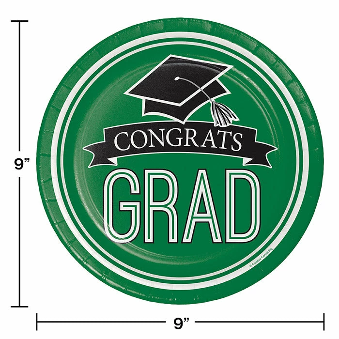 Details: Provide the perfect tableware for heartier meals at the graduation party with the School Spirit Green Plates. These Sturdy Style paper plates feature a classy design of a mortarboard and “Congrats Grad” message in the center, and will provide a nice touch to the end of a long journey. The 9″ round plates and can be coordinated with other School Spirit theme party supplies to celebrate the hard-working graduate’s accomplishment. For this price, you get one package containing (18) Graduation School Spirit Green Paper Plates. Approximate Dimensions: 8.75 in x 8.75 in
