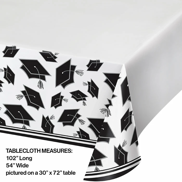 Details: Protect your table from spills and create a celebratory scene that matches the graduate’s school colors with the School Spirit White table covers. This 54″ x 102″ table cover is plastic and features border print of an assortment of graduation caps atop a white background. Perfect for indoor or outdoor use, the table covers can be mixed and matched with other School Spirit party supplies for a wonderful graduation celebration. You get one Graduation School Spirit White table cover for this price. Approximate Dimensions: 108 in x 54 in