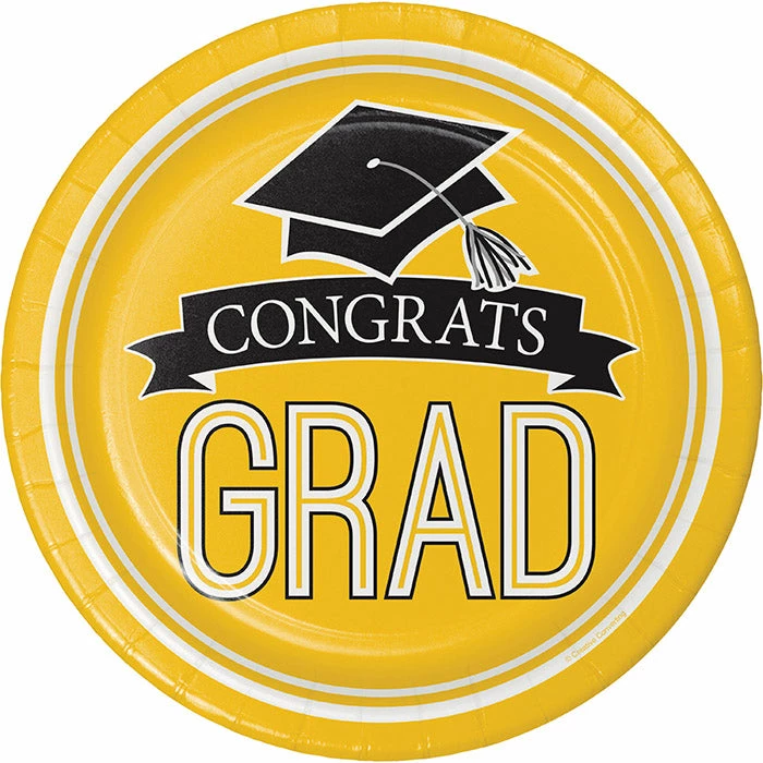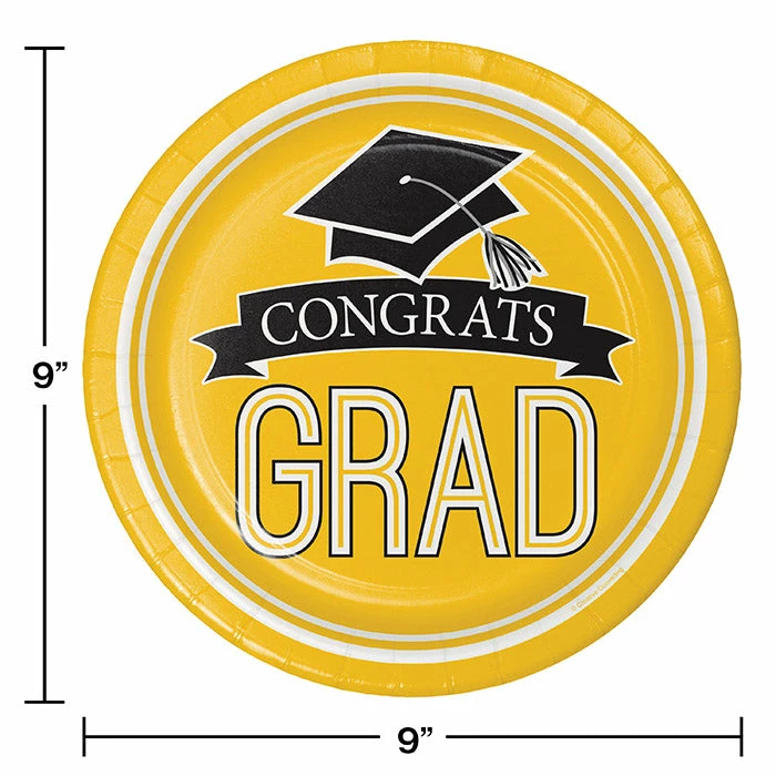 Details: Provide the perfect tableware for heartier meals at the graduation party with the School Spirit Yellow Plates. These Sturdy Style paper plates feature a classy design of a mortarboard and “Congrats Grad” message in the center, and will provide a nice touch to the end of a long journey. The 9″ round plates and can be coordinated with other School Spirit theme party supplies to celebrate the hard-working graduate’s accomplishment. For this price, you get one package containing (18) Graduation School Spirit Yellow Paper Plates. Approximate Dimensions: 8.75 in x 8.75 in