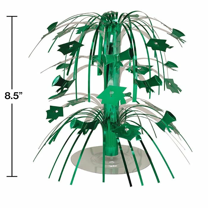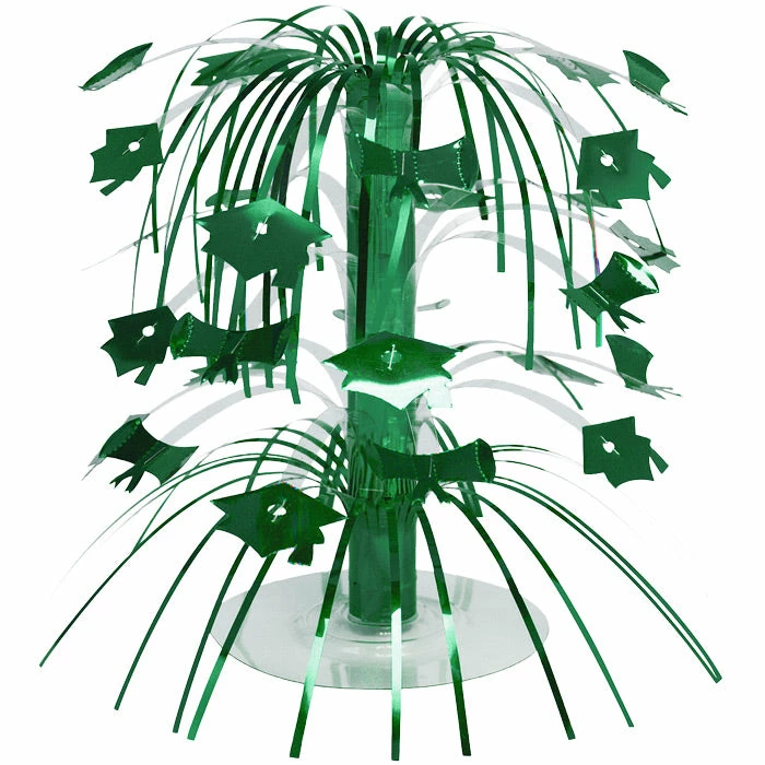 Details: Event planners, caterers and home hostesses alike can easily coordinate party decorations to graduates’ school colors with our wholesale Green Graduation Centerpiece. Each 8.5 inch tall centerpiece features a tiered design with green cascading foil fringe as well as green foil mortarboards and diplomas raining off the center support. Simply snap the base on and set the mini centerpiece on guest tables, buffet presentations, and dessert displays to honor the high school or college graduate. You get one Green Mortarboard Graduation Centerpiece for this price. Approximate Dimensions: 9 in x 9 in x 9 in