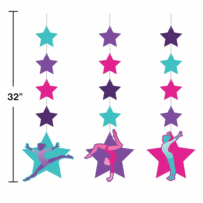 Details: The acrobatic gymnasts of the Gymnastics Party Hanging Cutouts will excite any little girl at her party. These hanging paper cutouts measure 32″ and feature stars and gymnasts with a pink, purple and teal theme. These paper cutouts coordinate with all Gymnastics Party party supplies. Our Gymnastics Party Hanging Cutouts are perfect for event planners, caterers, and home hostesses alike.