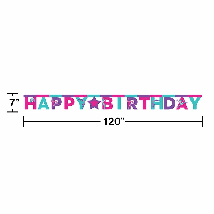 Details: Celebrate your little girl’s birthday in a colorful way when you hang the Gymnastics Party Banner. These paper banners measure 7″ x 120″ and feature the words “Happy Birthday” and gymnasts with a pink, purple and teal theme. These paper banners coordinate with all Gymnastics Party party supplies. Our Gymnastics Party Banners are perfect for event planners, caterers, and home hostesses alike.
