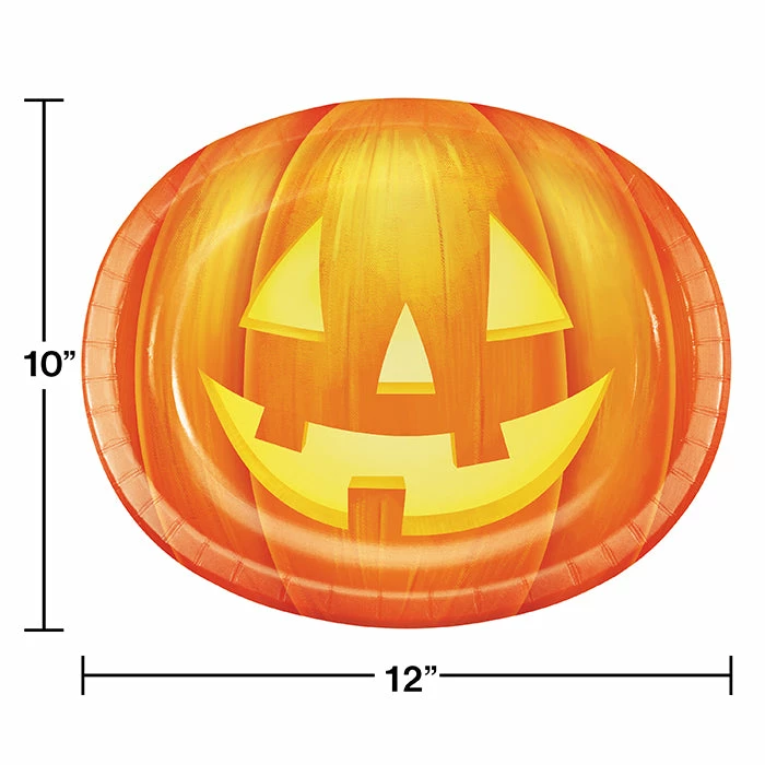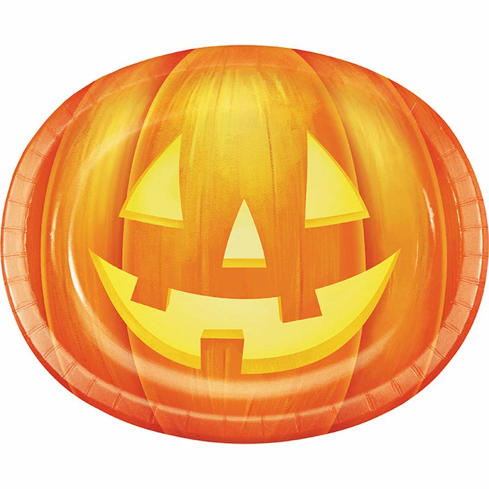 Details: Not all pumpkins are round some are a little wider. So use these Halloween Pumpkin Oval Plates. The Sturdy Style platter plates measure 10″ x 12″ and feature a giant carved smiling pumpkin. There is a counter display included that will hold them all. These premium paper plates can be combined with our other Halloween Pumpkin party supplies. With discount pricing and great quality our Halloween Pumpkin Oval Plates are perfect for event planners caterers and home hostesses alike. Approximate Size: 10″ x 12″. Material: Paper