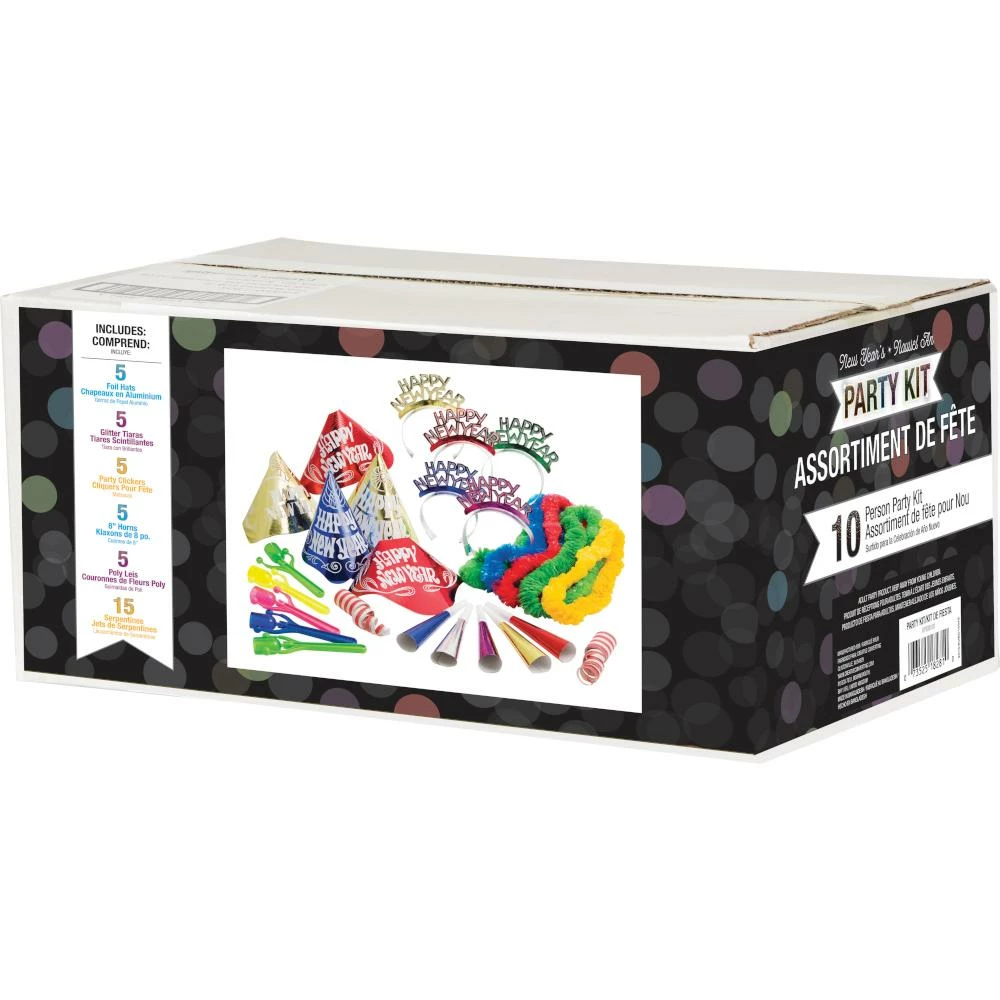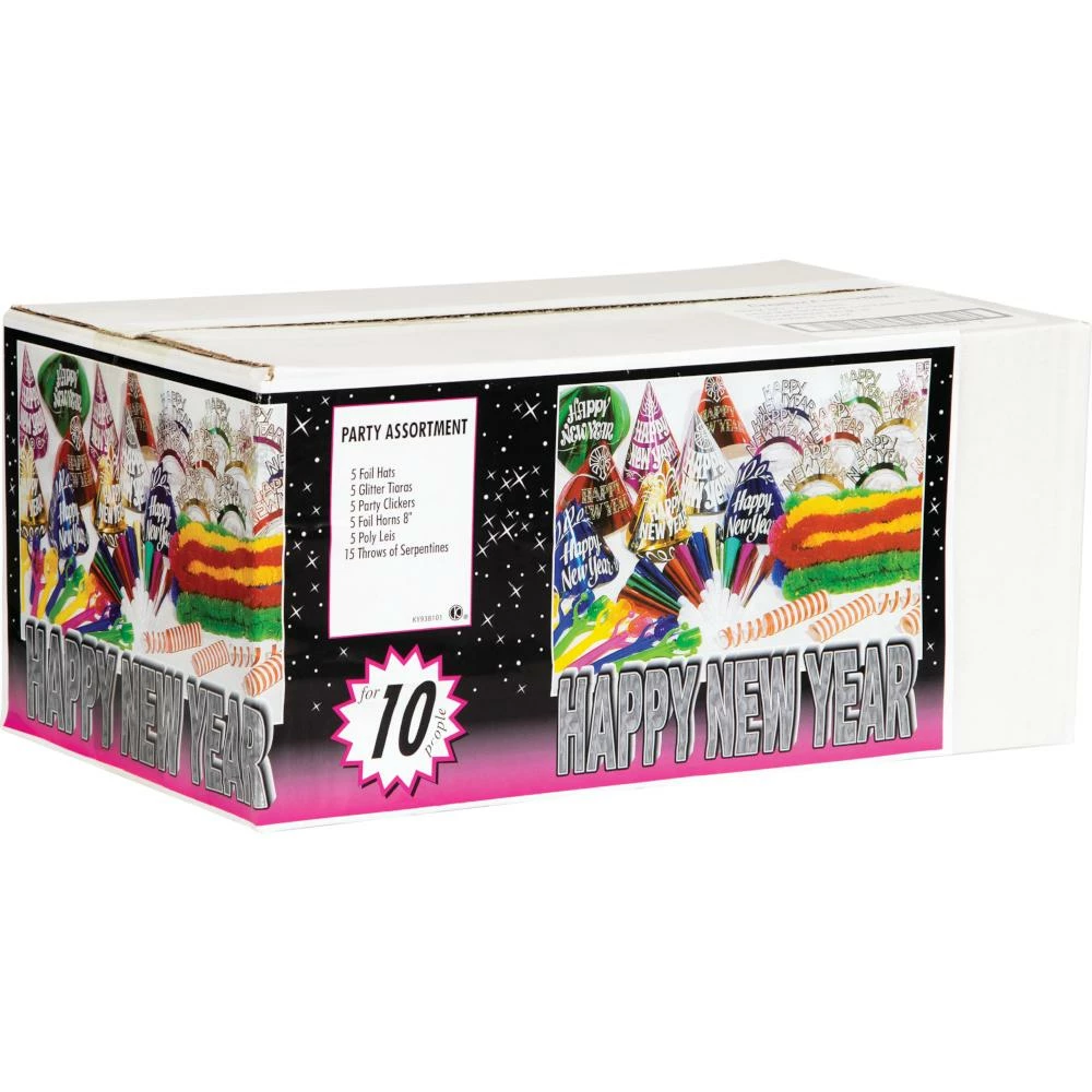 Details: Deck out your party guests for the big moment with our convenient Happy New Year Party Kit For 10. Hats, tiaras, leis, noisemakers and more are sure to liven up the celebration in honor of ushering out the old and welcoming in the new. Sold individually, each kit includes: 5 New Year Foil Hats, 5 New Year Glittered Tiaras, 5 Party Clickers, 5 Foil Horns, 5 Hawaiian Leis, and 15 Serpentine Throws. With discount pricing, our Happy New Year Party Kit For 10 are perfect for event planners, caterers, and home hostesses alike. You get one Happy New Year Party Kit For 10 for this price.