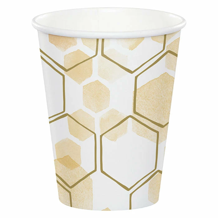 Details: The Honeycomb Paper Cups are perfect to share a glass of iced tea with your guests at your garden party. These sturdy paper cups hold 9 oz and feature an abstract honeycomb pattern with a white and gold theme. Sold in packs of 8, these disposable paper cups coordinate with all Honeycomb party supplies. Our Honeycomb Paper Cups are perfect for event planners, caterers, and home hostesses alike.