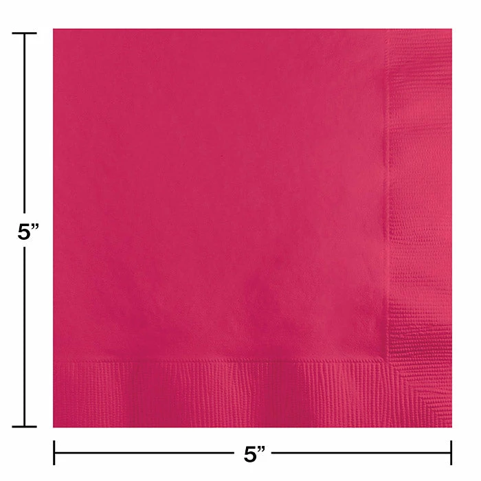 Details: These Hot Magenta Pink 3-Ply Beverage Napkins exhibit a soft yet firm composition. The facial quality tissue material provides excellent comfort and performance. A modern touch to your next get-together. With discount pricing, our Hot Magenta Beverage Napkins 3 ply are perfect for event planners, caterers, and home hostesses alike. For this price, you get one package containing (50) Hot Magenta Beverage Napkin, 3 Ply. Approximate Dimensions: 5 in x 5 in