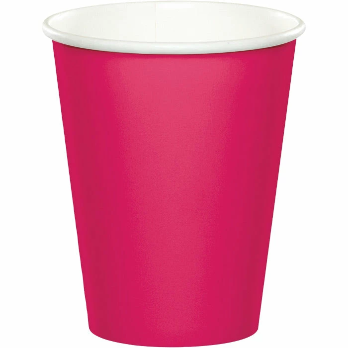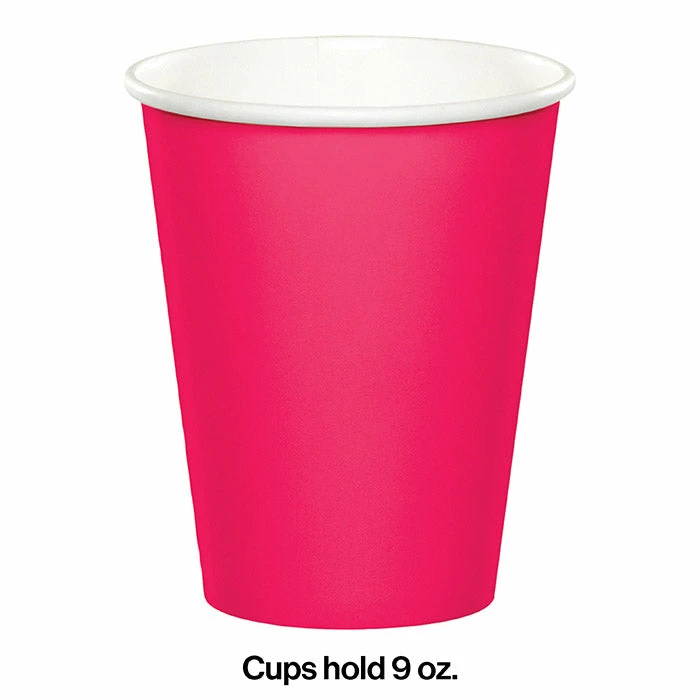 Details: Add classy style and balance to the decoration at catered events or gatherings with the Hot Magenta Hot & Cold Cups. Every package contains 24 sturdy paper cups in bright pink that hold 9 ounces of hot or cold beverages. Stack these cups in the beverage service area next to the punch bowl or coffee dispenser, or put one at each place setting for guests to use. The hot magenta color is ideal for receptions, showers or birthdays and the color coordinates with multiple printed theme ensembles. The Hot Magenta Hot & Cold Cups are packaged 24 each. For this price, you get one package containing (24) Hot Magenta Hot/Cold Paper Cups 9 Oz. Approximate Dimensions: 3.75 in