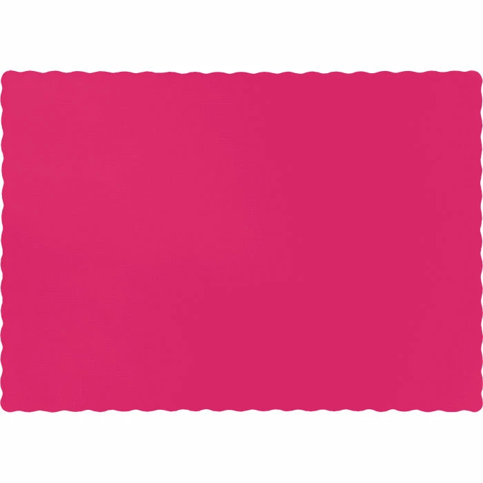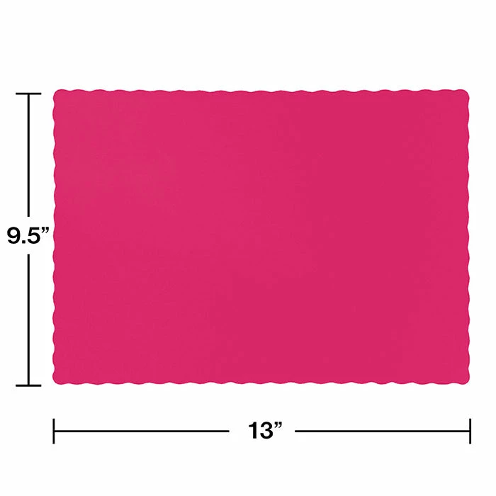 Details: For those larger parties or catered events, the Disposable Hot Magenta Placemats are a great way to add color and style to tables, trays or the buffet. These placemats measure 9.5 inches x 13.375 inches and have a delicate scalloped edge. The color looks great under contrasting printed theme plates and napkins. Use the bright pink for any birthday, reunion or reception that needs a wonderful splash of color. The Disposable Hot Magenta Placemats are packaged in quantities of 50 each. For this price, you get one package containing (50) Hot Magenta Pink Placemats. Approximate Dimensions: 13.5 in x 9 in