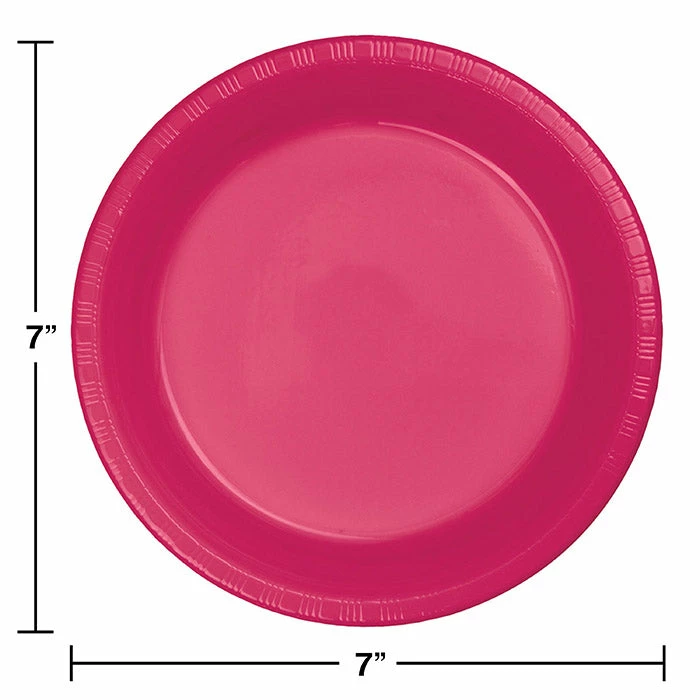 Details: Entertain in classy style and add a brilliant burst of color to any larger gathering or catered event with the Hot Magenta Plastic Dessert Plates. The 7 inch round plate features a decorative pleated rim and is ideal for desserts and appetizers served at birthdays, weddings or reunions. Each value set of 20 plastic plates builds the perfect foundation for any special event and sauces and juices from foods will not soak through! The color coordinates with multiple theme ensembles and the plates can also be arranged inside larger theme plates for an artistic touch. The Hot Magenta Plastic Dessert Plates are packaged in quantities of 20 plates each. For this price, you get one package containing (20) Hot Magenta Pink Plastic Dessert Plates. Approximate Dimensions: 7 in x 7 in