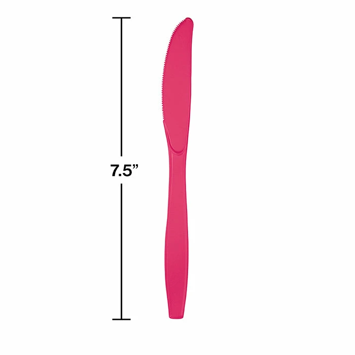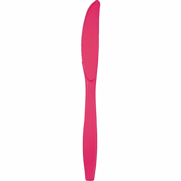 Details: Add a splash of hot pink to any party table with our wholesale Hot Magenta Plastic Knives. Event planners and party hosts who need quality plastic cutlery will love the exceptional quality and design of these elegant magenta plastic knives. Stylish and strong, these magenta knives will make your party table pop without putting a dent in your budget. Each premium-quality plastic knife is sturdy enough to last through an entire meal service. Plus, these disposable plastic knives offer fast, easy post-party clean-up. This magenta plastic flatware and our other magenta cutlery are competitively priced to offer significant savings for wholesale buyers who need high-quality disposable plastic cutlery at affordable prices. For this price, you get one package containing (24) Hot Magenta Pink Plastic Knives. Approximate Dimensions: 7.5 in