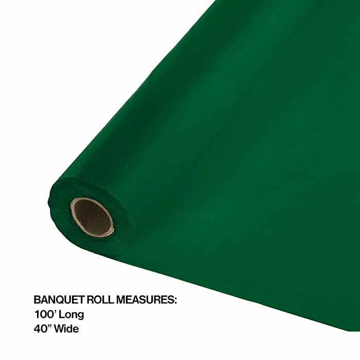 Details: This plastic tablecover roll is perfect for decorating multiple banquet sized tables and clean-up is a breeze. The 40 inch by 100 foot roll of Hunter Green is made of durable plastic and can be cut to fit any tables at your event. This banquet table roll is great for bigger occasions or catered parties, wherever you want a touch of dark green to coordinate with holiday or theme products. When the party is over, simply gather the tablecovers and throw away. The 100′ Hunter Green Plastic Table Roll is easy to store and is sold at a discount price. individually. You get one Hunter Green Banquet Roll 40″ X 100′ for this price. Approximate Dimensions: 100 ft x 40 in
