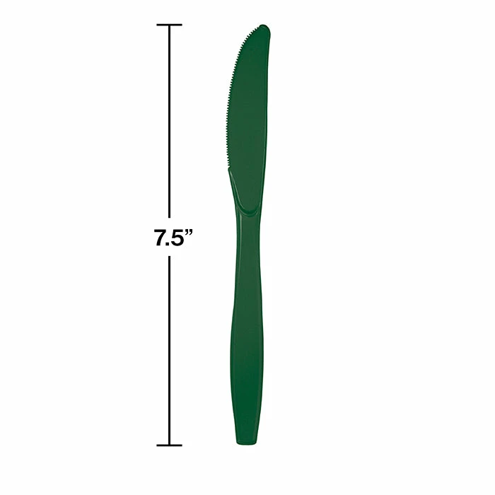 Details: Our wholesale Emerald Green Plastic Knives and other emerald green cutlery will exceed your expectations while meeting your serving needs. Event planners and party hosts looking for durable plastic cutlery will love the exceptional quality and design of these elegant wholesale emerald green knives. Each disposable plastic knife offers quick post-party clean-up, because this heavy duty plastic cutlery can be easily thrown away or recycled at the end of a meal. Our wholesale plastic flatware is competitively priced, making our entire green cutlery perfect for restaurateurs, party planners, and savvy party hosts on a budget. For this price, you get one package containing (24) Hunter Green Plastic Knives. Approximate Dimensions: 7.5 in