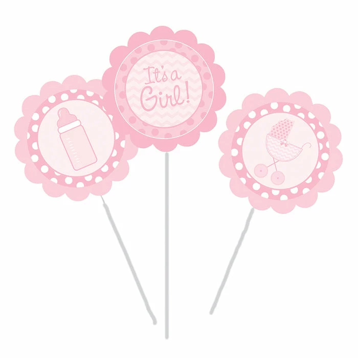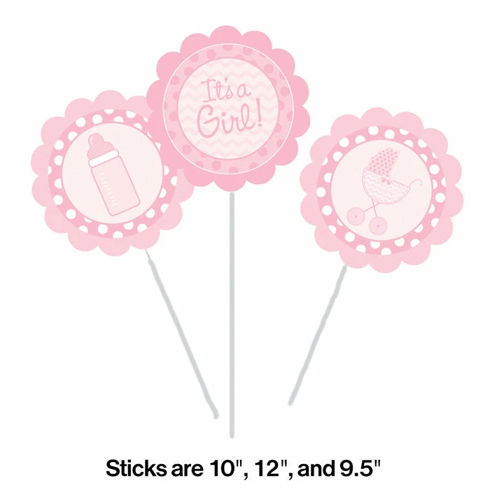 Use this (18ct) Centerpiece Sticks, It’s a Girl to decorate and make your baby shower even more special. You get 3 sticks/signs per package and 6 packages per case. Total Case count = 18. Key Tags: Party Supplies, Baby Shower Supplies, Baby Shower Decorations.Sticks are 9.5 inches, 10 inches and 12 inches. Cutouts are 6 inches. Only signs and sticks are included.????Ã Other items are for display of product only.