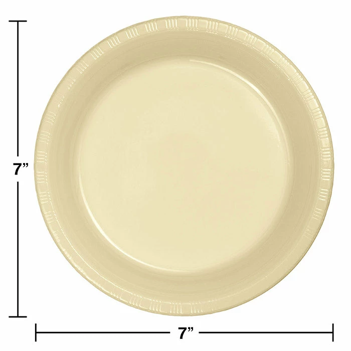 Details: Decorate with style and ease at any larger gathering or catered event with the Ivory Plastic Dessert Plates. The 7 inch round plate is strong enough for desserts and appetizers served at graduations, showers or weddings and the color coordinates with numerous theme ensembles. Each set of 20 plastic plates will help make the perfect foundation for any special event and sauces and juices from foods will not soak through! The plates can also be displayed inside larger theme plates for a nice accent. The Ivory Plastic Dessert Plates are sold in packages of 20 plates. For this price, you get one package containing (20) Ivory Plastic Dessert Plates. Approximate Dimensions: 7 in x 7 in