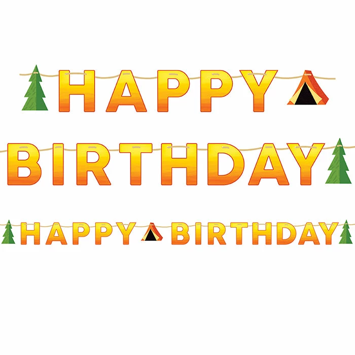 Details: Tie your woodland theme together with the Camping Party Banner. This hanging decoration features a “Happy Birthday” message with tree and camping tent cutouts. These banners are the perfect party decoration for a camp party theme. With discount pricing, our Camping Party Banners are perfect for event planners, caterers, and home hostesses alike. You get one Camp Out Letter Banner W/Twine for this price. Approximate Dimensions: 66 in x 6 in