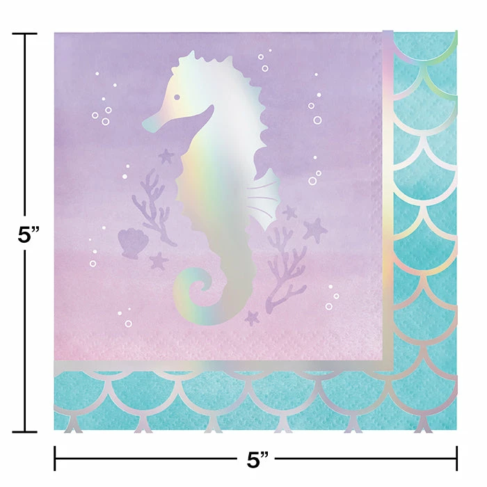 Details: Bring your underwater theme to life with the Iridescent Mermaid Party Beverage Napkins. These beautiful 5″ party napkins display a purple background with darker purple coral and shells and a light teal border on the bottom and right side that is made of scales. In the center is a white seahorse and bubbles. These disposable napkins perfectly accentuate other Iridescent Mermaid Party party supplies. With discount pricing, our Iridescent Mermaid Party Beverage Napkins are perfect for event planners, caterers, and home hostesses alike. For this price, you get one package containing (16) Iridescent Mermaid Party Beverage Napkins. Approximate Dimensions: 5 in x 5 in