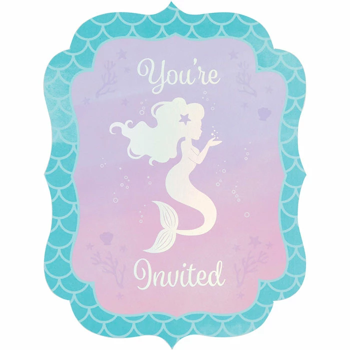 Details: Let the party preparations begin with the Iridescent Mermaid Party Invitations! These 4.5″ x 6″ postcard invitations feature an iridescent purple background and says “You’re Invited”. There is a wavy border of teal scales all around and space on the other side of the card for all of your party details. The invitations can be combined with our other Iridescent Mermaid Party party supplies. With discount pricing, our Iridescent Mermaid Party Invitations are perfect for event planners, caterers, and home hostesses alike. For this price, you get one package containing (8) Mermaid Shine Invitation Postcards. Approximate Dimensions: 4.5 in x 5.9 in