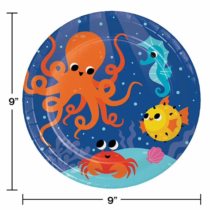 Details: Delight your child at their next birthday party with the charming sea creatures found on the Ocean Celebration Paper Plates. These sturdy paper plates measure 9″ and feature friendly cartoon sea animals with a blue, yellow, and red theme. These disposable paper plates coordinate with all Ocean Celebration party supplies. Our Ocean Celebration Dinner Plates are perfect for event planners, caterers, and home hostesses alike.