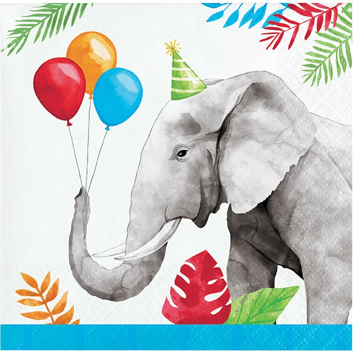 Details: Take a walk on the wild side at your birthday celebration with our Party Animals Cocktail Napkins. The napkins measure 5 inches square, and are made from soft and absorbent two-ply tissue, perfect for serving drinks, apps, and desserts. The napkin design features an elephant with a party hat and balloon, plus colorful jungle leaves. Our Party Animals Cocktail Napkins are part of our Party Animals collection, which includes everything you need for your celebration. Sold 16 napkins per package, grab these for your party today! Our Party Animals Beverage Napkins are perfect for event planners, caterers, and home hostesses alike.