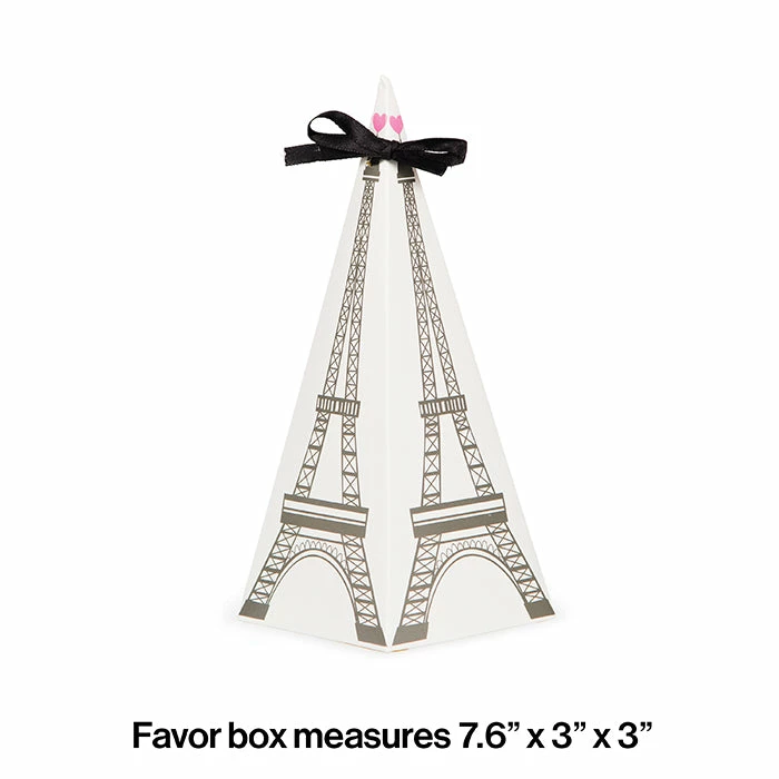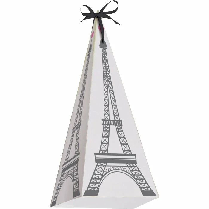 Details: Offer party guests internationally inspired treats and trinkets in these cone shaped Paris Party Favor Boxes. The discount treat boxes feature an image of the Eiffel Tower which is accented by the unique box design all topped off with a stylish black bow. The favor boxes coordinate perfectly with tableware and decorations from the complete line of wholesale Paris birthday party supplies. For this price, you get one package containing (8) Party In Paris Favor Boxes. Approximate Dimensions: 9.025 in x 6.5 in x 9 in