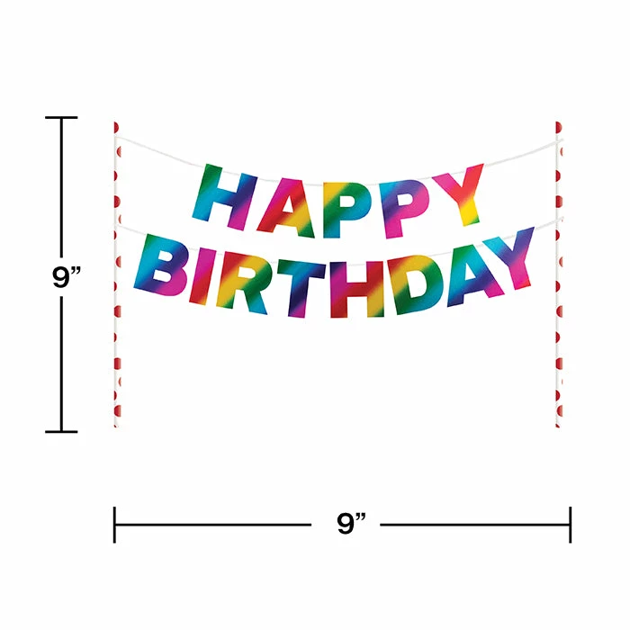 Details: You’ve got a banner for your wall or to hang from the ceiling now you can add one to your cake too. There are two posts with red dots to hold up the banner that says “Happy Birthday” in a rainbow font. This 9″ x 9″ cake banner can be coordinated with our other Rainbow Foil party supplies. With discount pricing and great quality our Rainbow Foil Happy Birthday Cake Banners are perfect for event planners caterers and home hostesses alike. Approximate Size: 9″ x 9″. Material: Paper Foil
