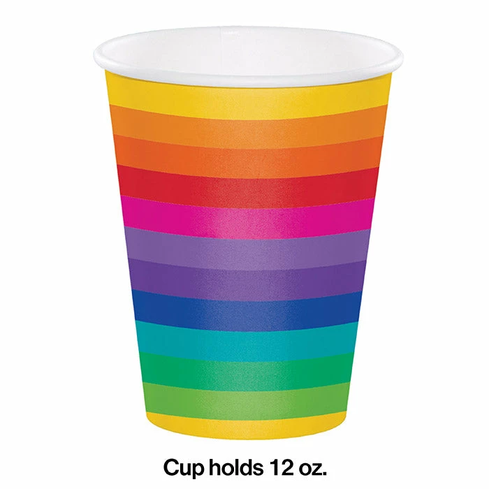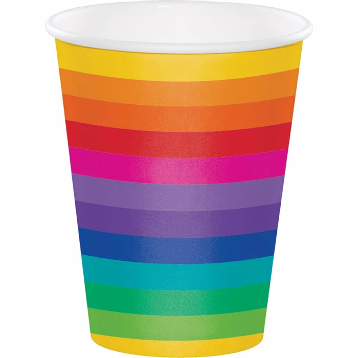 Details: Keep the beverages flowing at the rainbow party event and have plenty of wholesale Rainbow Cups on hand for guests. The disposable hot/cold cups can be used for serving icy punch or soda and they can also be set at the coffee bar for hot drinks. The sturdy cups are perfect for holding utensils and napkins or they can be filled with snacks for guests to carry around and munch. For this price, you get one package containing (8) Rainbow Hot/Cold Paper Paper Cups 12 Oz. Approximate Dimensions: 4.25 in