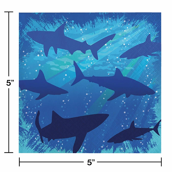 Details: Moving silently through cool ocean waters are shadowy creatures hunting their next meal. The Shark Splash Beverage Napkins feature gentle rays of light piercing the ocean depths while blue silhouettes of sharks circle for prey. These decorative 3-ply napkins are the perfect size to hand out with dessert servings, appetizers, or party drinks at birthday celebrations, aquarium shows, or sea life park concessions. The quarter fold napkins coordinate perfectly with the rest of the ensemble supplies and party planners, resellers, and caterers will want to keep this popular design in stock. Combine the disposable napkins with solid colored tableware for decorations that make a big splash. Napkins measure 4.938 inches square and are sold in quantities of 16 per package. For this price, you get one package containing (16) Shark Splash Beverage Napkin, 3 Ply. Approximate Dimensions: 5 in x 5 in
