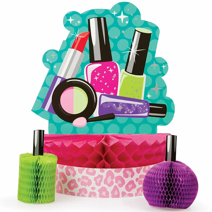 Details: Have makeup all over the table with the Sparkle Spa Party Centerpiece Set. This kit has a honeycomb base with a cutout featuring different makeup pieces and two honeycomb polish bottles. This kit coordinates seamlessly with our other Sparkle Spa Party party supplies. With discount pricing, our Sparkle Spa Party Centerpiece Sets are perfect for event planners, caterers, and home hostesses alike. You get one Sparkle Spa Party Centerpiece Set for this price. Approximate Dimensions: 9 in x 12 in
