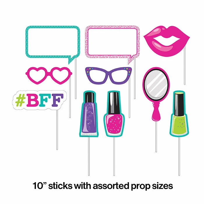 Details: Lights, camera, action! Use these Sparkle Spa Party Photo Booth Props to create fun scenes for pictures. These props come in assorted sizes and include things like glasses, lips, makeup accessories, a mirror and a couple of speech balloons that you can write on. These props can be used with any of our Sparkle Spa Party party supplies. With discount pricing, our Sparkle Spa Party Photo Booth Props are perfect for event planners, caterers, and home hostesses alike. For this price, you get one package containing (10) Sparkle Spa Party Photo Booth Props.