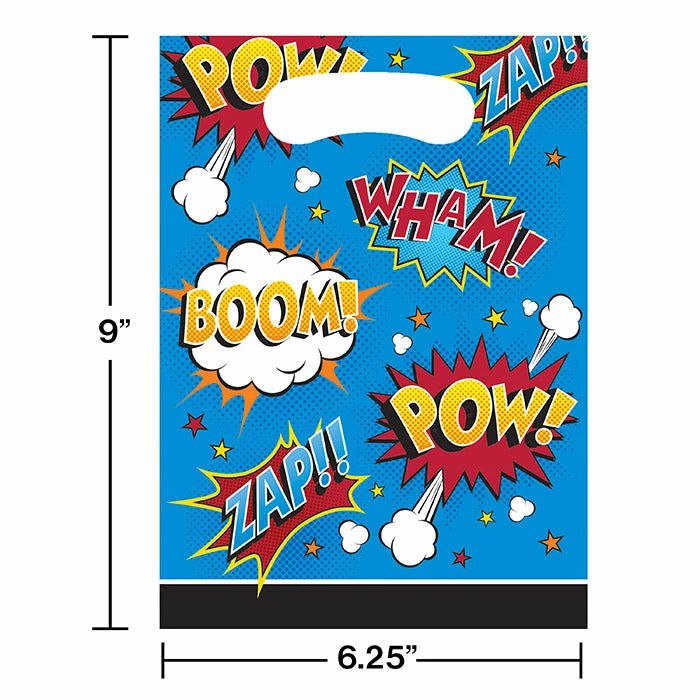Details: Keep the party going when you send your guests home with goodies in these Superhero Slogans Favor Bags. These bags feature a blue background and lots of superhero action sounds like “Boom”, “Pow” and “Wham”. These party bags are the perfect addition to any celebration! These items coordinate seamlessly with our other Superhero Slogans party supplies. With discount pricing, our Superhero Slogans Favor Bags are perfect for event planners, caterers, and home hostesses alike. For this price, you get one package containing (8) Superhero Slogans Favor Bags. Approximate Dimensions: 6.5 in x 9 in