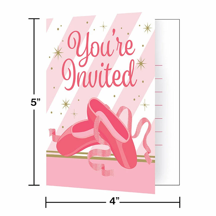 Invite friends and family to your little girl’s birthday celebration with the Ballet Invitations. The 5″ x 4″ foldovers display large pink text reading “You’re Invited” on the front with pointe shoes & glistening stars in the background and provide plenty of room for party details on the inside. These invites come with envelopes for easy mailing. With wholesale pricing and bulk quantities, our Ballet Invitations 48 ct are perfect for event planners, caterers, and home hostesses alike.