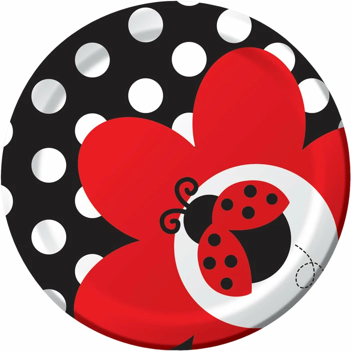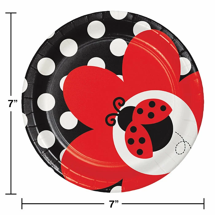 Details: Classy and whimsical, this adorable tableware pattern will have all the party guests smiling. The Ladybug Fancy Dessert Plates feature a backdrop of velvet black covered with large white dots with a red flower printed off to the side. Flitting through the white flower center is a delightful black and red ladybug. The snack plate is made of heavyweight paperboard stock and has a slightly raised rim to help keep foods on the plate. Use the plate for appetizers, finger foods or dessert servings at birthday celebrations, baby showers, or other catered affairs. These plates are great for event planners or casual dining establishments to keep in stock and coordinate wonderfully with the rest of the theme supplies as well as with solid colored tableware and accessories. Plates measure 6.875 inches in diameter and are sold in quantities of 8 per package For this price, you get one package containing (8) Ladybug Fancy Dessert Plates. Approximate Dimensions: 6.875 in x 6.875 in