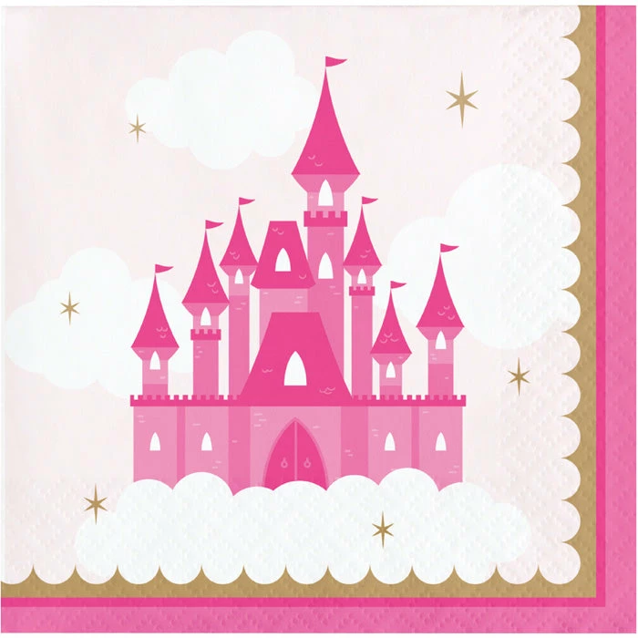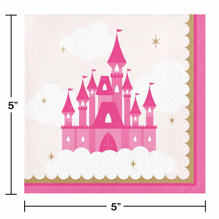 Details: Pair your delicious party drinks and snacks with these Little Princess Beverage Napkins. Featuring an elegant pink color with a princess castle centered in the middle, these napkins are the perfect addition to your celebration. Measuring 5″ these napkins can be paired with any other Little Princess party supplies. Our Little Princess Beverage Napkins are perfect for event planners, caterers, and home hostesses alike.