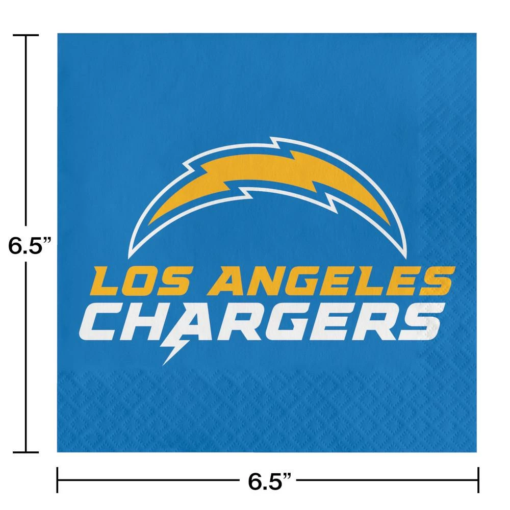 Details: Score points with fans and customers when you offer winning licensed NFL tableware products. The Los Angeles Chargers Luncheon Napkins are constructed of sturdy 2-ply tissue and feature a bold navy blue background printed with the team helmet in white, the arc of the golden lightning bolt emblem on the headgear outlined in blue. Below the helmet the name Chargers” is printed in white block lettering. These disposable napkins are perfect to stock in restaurants, bars, concession stands, party supply retail stores and more. The lunch size napkins are perfect to use when serving messy dishes or heartier meals. Score points and combine the napkins with other items from the collection along with coordinating solid color tableware and accessories. Lunch napkins measure 6.375 inches by 6.375 inches and are sold 16 per package.