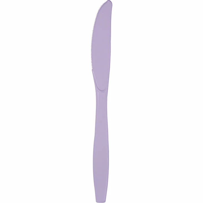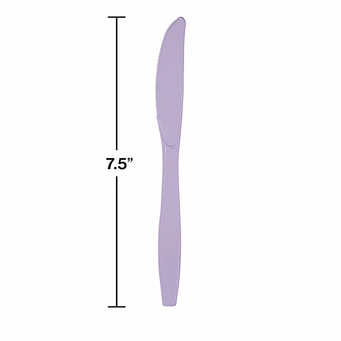 Details: When it comes to parties, it is all about color, and our wholesale Luscious Lavender Plastic Knives fit the bill! These lovely lavender knives and our other light purple cutlery will add that special burst of color you need to add visual appeal to any buffet or table setting. Stylish and sturdy, these disposable plastic knives offer quick post-party clean-up; simply throw away or recycle this heavy duty plastic cutlery after events. Pick up some of our Luscious Lavender Plastic Knives and matching lavender cutlery today to see firsthand how durable and affordable they are for all your partyware needs. For this price, you get one package containing (24) Luscious Lavender Purple Plastic Knives. Approximate Dimensions: 7.5 in