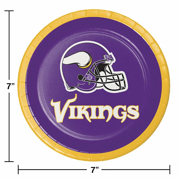 Details: Fans can serve their favorite party snacks to guests on our Minnesota Vikings Dessert Plates this season. These small plates feature Minnesota’s logo and colors making them coordinate easily with our Minnesota Vikings party supplies. Stock up on our selection of paper plates for all kinds of football party fun. Approximate Size: 6.875″. Material: Heavyweight Paperboard
