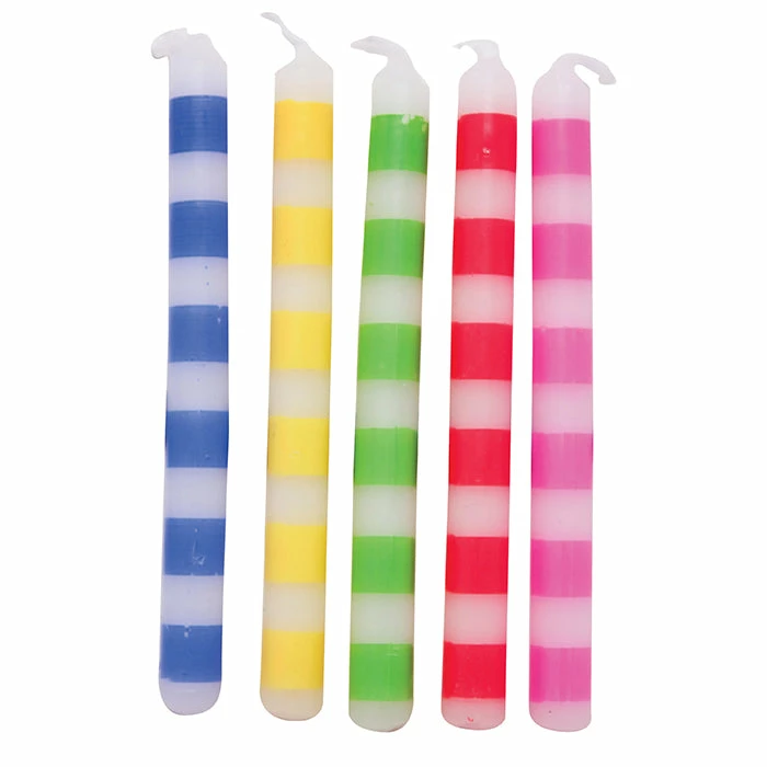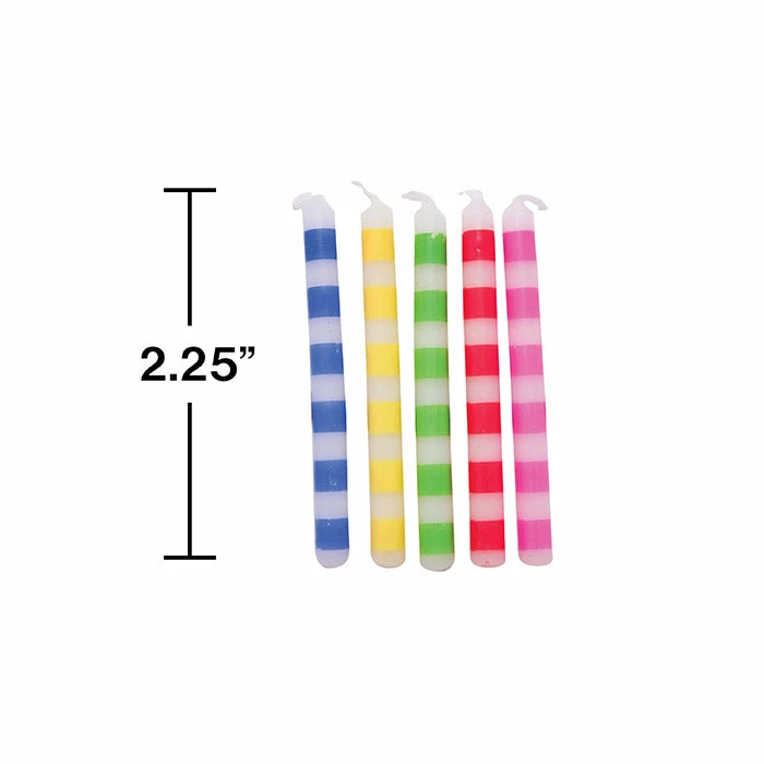 Details: Say goodbye to boring flames! Add a little color to your cake with Multicolor Striped Candles. These vibrant candles are featured in a variety of colors which makes it super easy to decorate. With discount pricing, our Multicolor Striped Candle are perfect for event planners, caterers, and home hostesses alike. For this price, you get one package containing (20) Multicolor Striped Candles. Approximate Dimensions: 0.125 in x 2.188 in