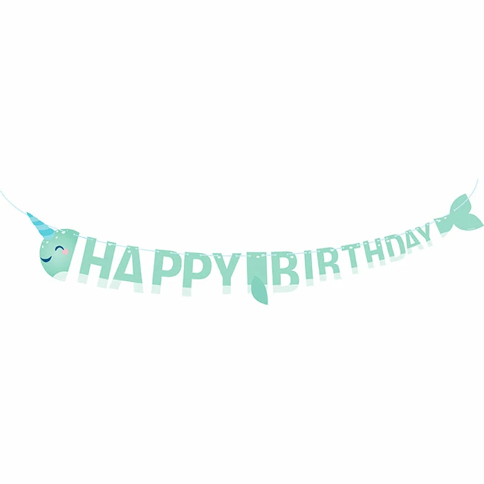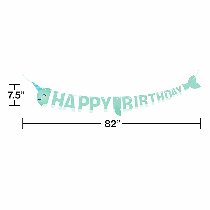 Details: Set a festive scene at your narwhal birthday party with our Narwhal Party Banner. This banner features letters that spell HAPPY BIRTHDAY, with a Narwhal head, flipper, and tail. Measuring 82″ x 7.5″, hang the banner above the cake or gift table to make a visual impact at the party. complete the look with our other Narwhal Party supplies. Our Narwhal Party Banners are perfect for event planners, caterers, and home hostesses alike.