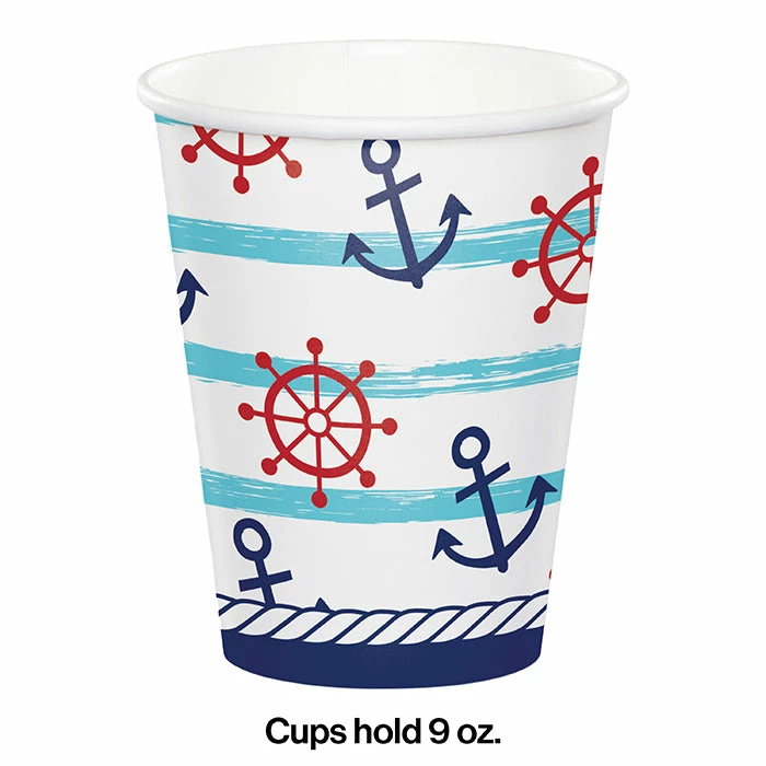 Make a splash when you serve your guests a drink from the Nautical Baby Shower Cups. These sturdy paper cups hold 9oz and feature captain’s wheels and anchors with a blue, white, and red theme. Sold in packs of 96, these paper cups coordinate with all Nautical Baby Shower party supplies. With wholesale pricing and bulk quantities, our Nautical Baby Shower Cups 96 ct are perfect for event planners, caterers, and home hostesses alike.