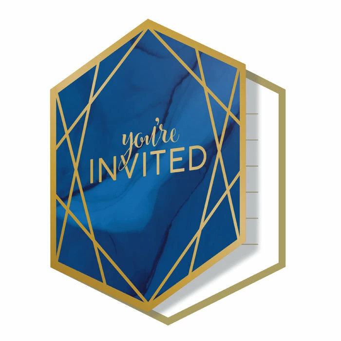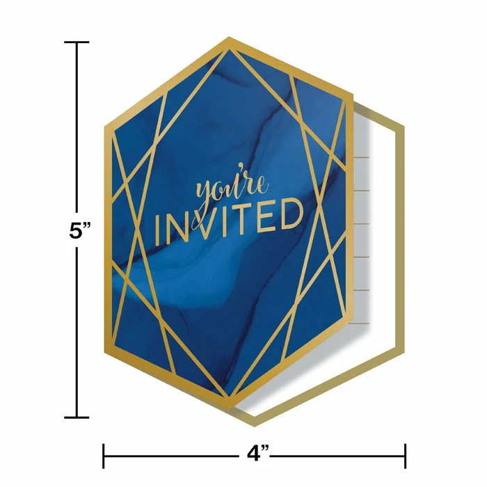 Invite your guests to the celebration of a lifetime with these Navy Blue and Gold Foil Invitations. Featuring an elegant blue and gold geometric design, these invites are the perfect way to get your guests excited for the big day. Measuring 4″ x 5″ and sold in quantities of 48, these invites coordinate perfectly with any other Navy Blue and Gold Foil party supplies. With wholesale pricing and bulk quantities, our Navy Blue and Gold Foil Invitations 48 ct are perfect for event planners, caterers, and home hostesses alike.