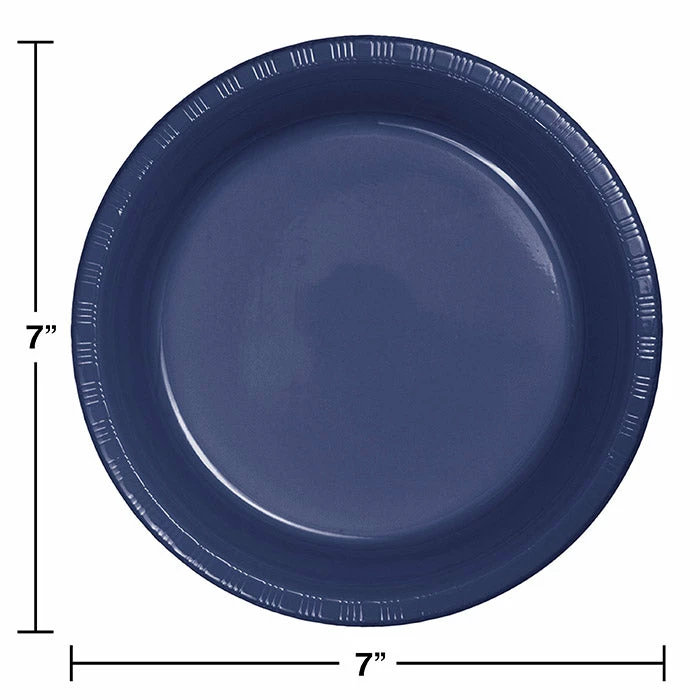 Details: Entertain in style and add bold color to any larger gathering or catered event with the Navy Plastic Dessert Plates. The 7 inch round plate is strong enough for desserts and appetizers served at graduations, birthdays or weddings and the color coordinates with multiple theme ensembles. Each set of 20 plastic plates will help make the perfect foundation for any special event and sauces and juices from foods will not soak through! The plates can also be arranged inside larger theme plates for an artistic touch. The Navy Plastic Dessert Plates arrive in retail ready packaging of 20 each. For this price, you get one package containing (20) Navy Blue Plastic Dessert Plates. Approximate Dimensions: 7 in x 7 in