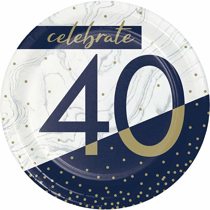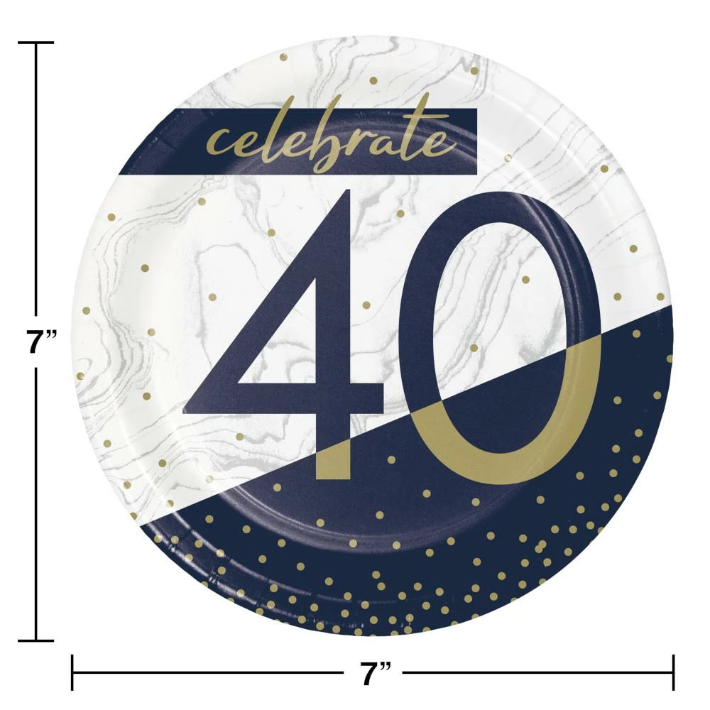 Details: Celebrate your 40th Birthday and treat your guests to a delicious piece of cake served on the Navy and Gold 40th Birthday Dessert Plates. These sturdy paper plates measure 7″ and feature confetti dots and the words “Celebrate 40” with a gold, navy, and white theme. Sold in packs of 8, these disposable paper plates coordinate with all Navy and Gold party supplies. Our Navy and Gold 40th Birthday Dessert Plates are perfect for event planners, caterers, and home hostesses alike.