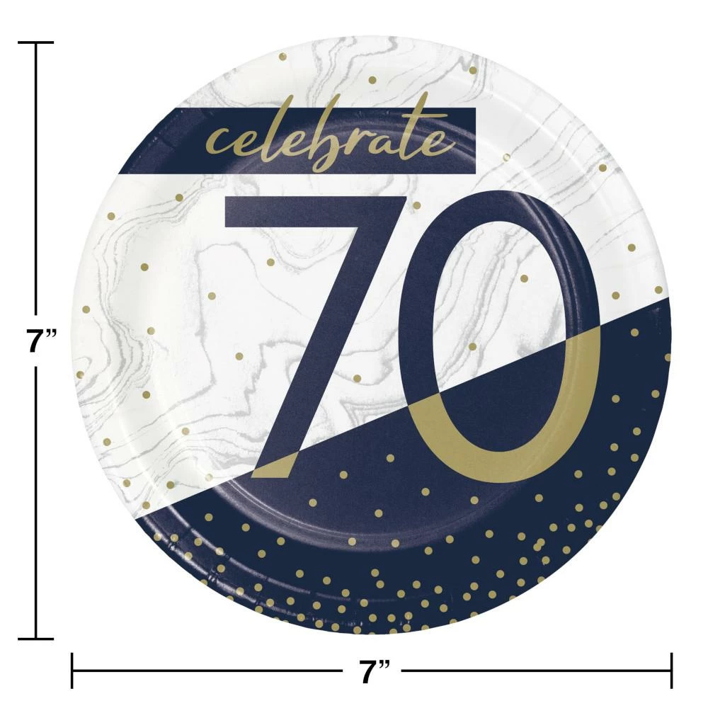 Details: Celebrate your 70th Birthday and treat your guests to a delicious piece of cake served on the Navy and Gold 70th Birthday Dessert Plates. These sturdy paper plates measure 7″ and feature confetti dots and the words “Celebrate 70” with a gold, navy, and white theme. Sold in packs of 8, these disposable paper plates coordinate with all Navy and Gold party supplies. Our Navy and Gold 70th Birthday Dessert Plates are perfect for event planners, caterers, and home hostesses alike.