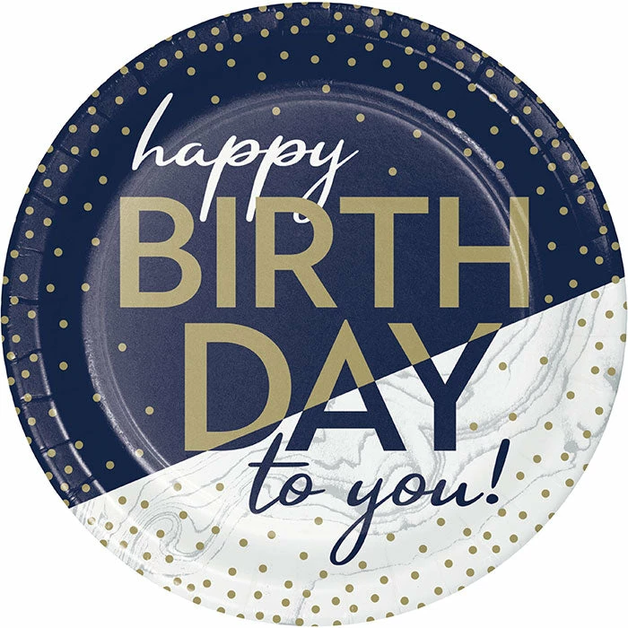 Details: Your party for that special person will be a smash hit when you serve the cake on the stylish Navy and Gold Birthday Dessert Plates. These sturdy paper plates measure 7″ and feature confetti dots and the words “Happy Birthday To You!” with a gold, navy, and white theme. Sold in packs of 8, these disposable paper plates coordinate with all Navy and Gold party supplies. Our Navy and Gold Birthday Dessert Plates are perfect for event planners, caterers, and home hostesses alike.