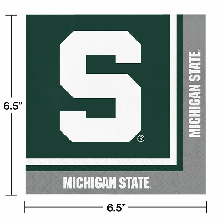 Details: Show your team spirit when you serve your patrons using Michigan party supplies. Michigan State Luncheon Napkins 2 Ply measure 6.375″ x 6.375″ when folded and are printed in the school colors of green and white. A green border runs along the edge of the napkin with the words “Michigan State” in white lettering. A white band runs between the border and the center of the napkin which is green with a large “S” logo. Each package contains 20 napkins. For this price, you get one package containing (20) Michigan State University Napkins. Approximate Dimensions: 6.4 in x 6.4 in