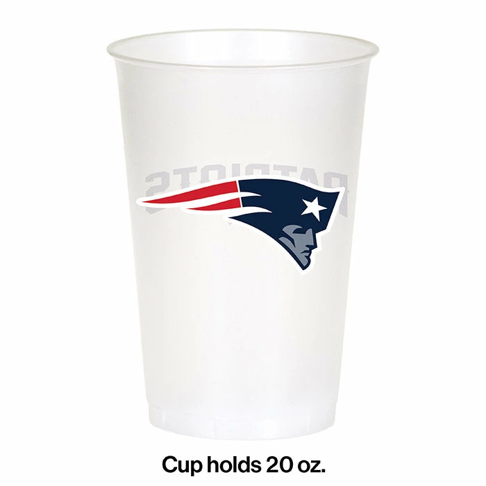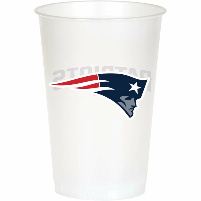 Details: Add the perfect accent to any bar or tailgating event with these offerings! The New England Patriots 20 Ounce Plastic Cups are designed to fit in with any football themed event or game watching party featuring the team colors and logos. The clear cups are constructed with #6 recyclable plastic and are printed with the red white and blue patriot head logo on one side and the team name on the other. Serve cold beverages or snacks in the festive cups for the ultimate fan experience. Cups are packaged in quantities of 8. Approximate Size: 20 oz. Material: #6 Recyclable Plastic