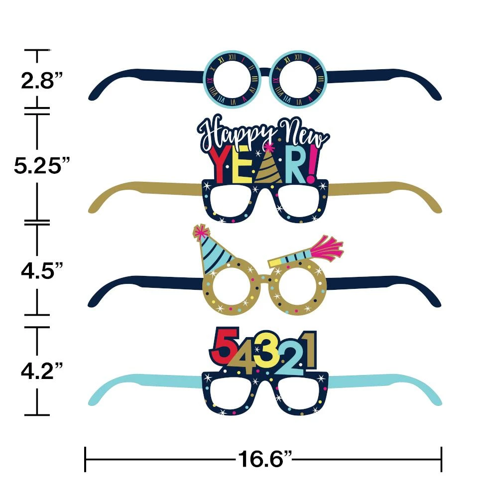 Details: Pass out the New Year Paper Eyeglasses and have fun counting down to midnight together. These paper eyeglasses measure 3″ x 16.5″, 5.25″ x 16.5″, 4.5″ x 16.5″ and 4″ x 16.5″ and feature various New Year designs with a multicolored theme. these paper eyeglasses coordinate with all New Year party supplies. With discount pricing, our New Year Paper Eyeglasses are perfect for event planners, caterers, and home hostesses alike. Shop at PartyDecorations.com for all our discount party supplies.