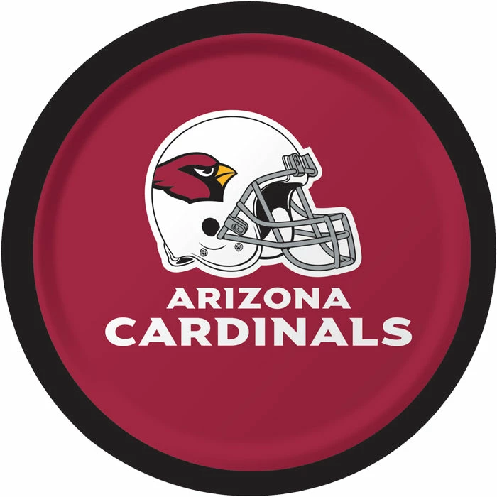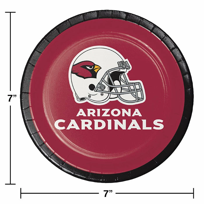 Details: Gather fans of the Bird Gang and serve up some snacks on these offerings! Our Arizona Cardinals Dessert Plates are drenched in the team colors and logo for the perfect addition to any game watching party tailgating experience sports bar or party venue. The officially licensed sturdy paper plates feature a red background set off with a black border and an image of the Cardinals white helmet with the team name printed below. These are great for serving appetizers finger foods sides and desserts. Plates measure 6.875″ in diameter and are packaged in quantities of 8. Approximate Size: 6.875″. Material: Heavyweight Paperboard